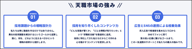 天職市場は、採用に特化したコンサルタント企業です。今まで20,000社以上の採用をサポートしてきた豊富な実績から、それぞれの企業の採用力向上に向けた採用ブランディング構築や採用マーケティングを提案しています。天職市場が運用する採用オウンドメディア「tenichi」を始めとして、Indeed運用で培ったノウハウを活かしたさまざまな求人検索エンジンへの広告掲載支援や、企業の求める求職者に選ばれる自社採用サイトの構築など、より良い人材を集めたいという企業の要望をトータルでサポートしています。